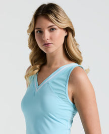 The stretch-enhanced fabric allows for unrestricted movement, while the halter neckline with criss-cross trim detailing delivers a flattering, fashion-forward look. Designed with 44% recycled polyester, this eco-conscious tennis tank is a sustainable and durable addition to your activewear collection.
